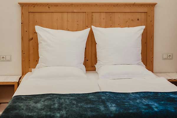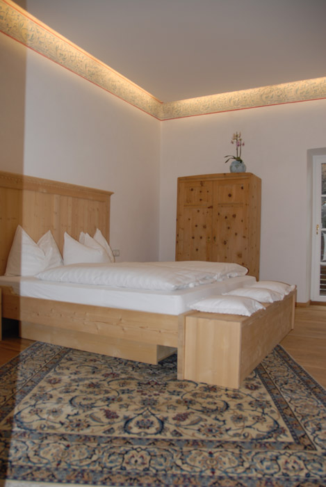 Our rooms make you want to stay even longer than the time necessary for a good night’s sleep. Every room is furnished individually, with original paintings by great nineteenth century and twentieth century South Tyrol artists from the turn of the century, when the Kuppelrain was built of solid stone, from the cellar to the roof: slate and mica from the Sonnenberg quarry. We left a wall without plaster, to document the grandiose art of construction of the time. We used local materials for the restoration of the building. The marble, for example, has an insuperably white colour that cannot be found anywhere else in the world, which comes from the town of Lasa in the beautiful Venosta Valley. When we were kids we played with cubes of marble, with which we built castles. The same cubes of marble, which my father had squared by hand for our house when he was young, now decorate the entrance to our restaurant. The wood used comes from the local woods and was left with a natural colour to harmonise perfectly with the antique wooden furniture that was already present.